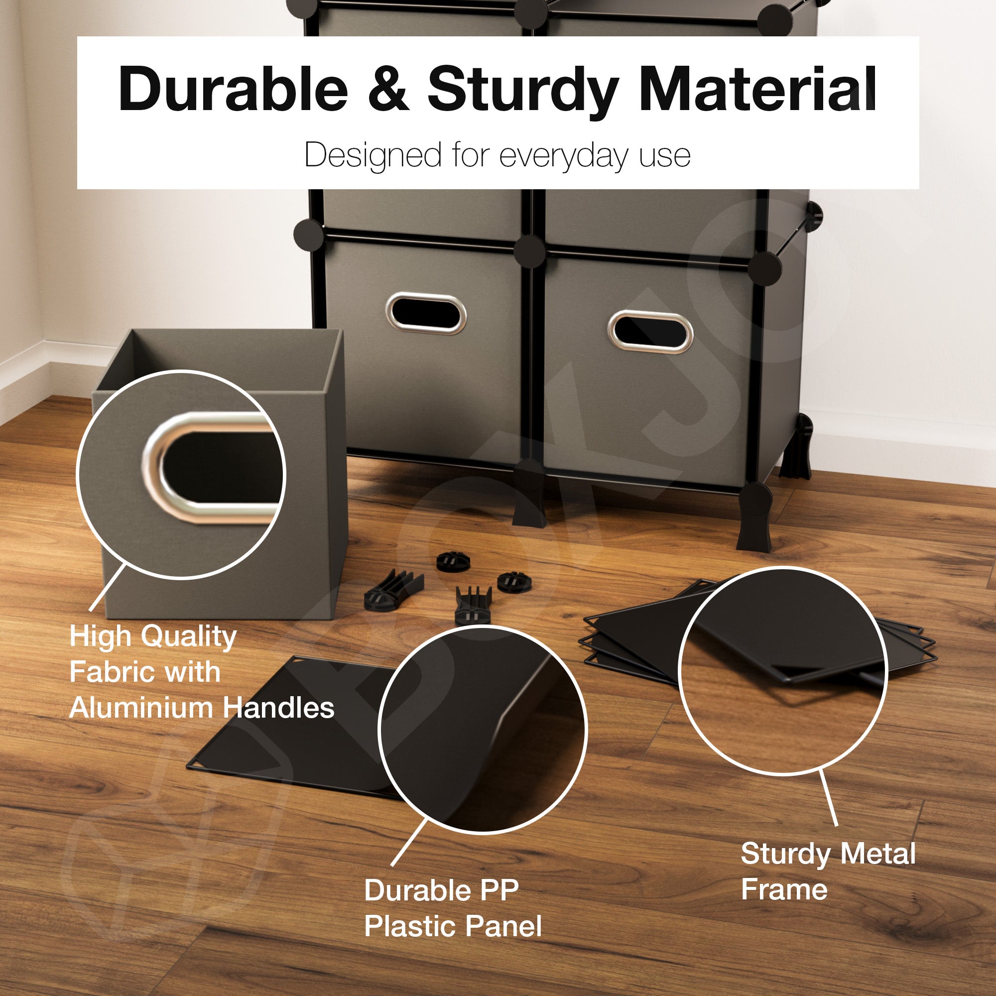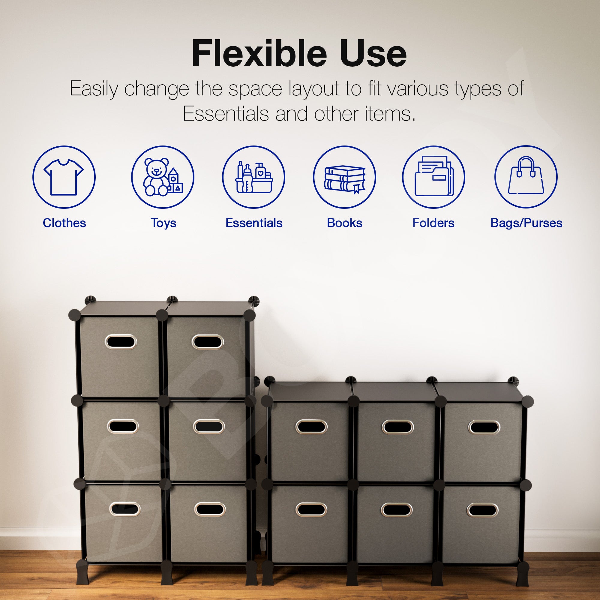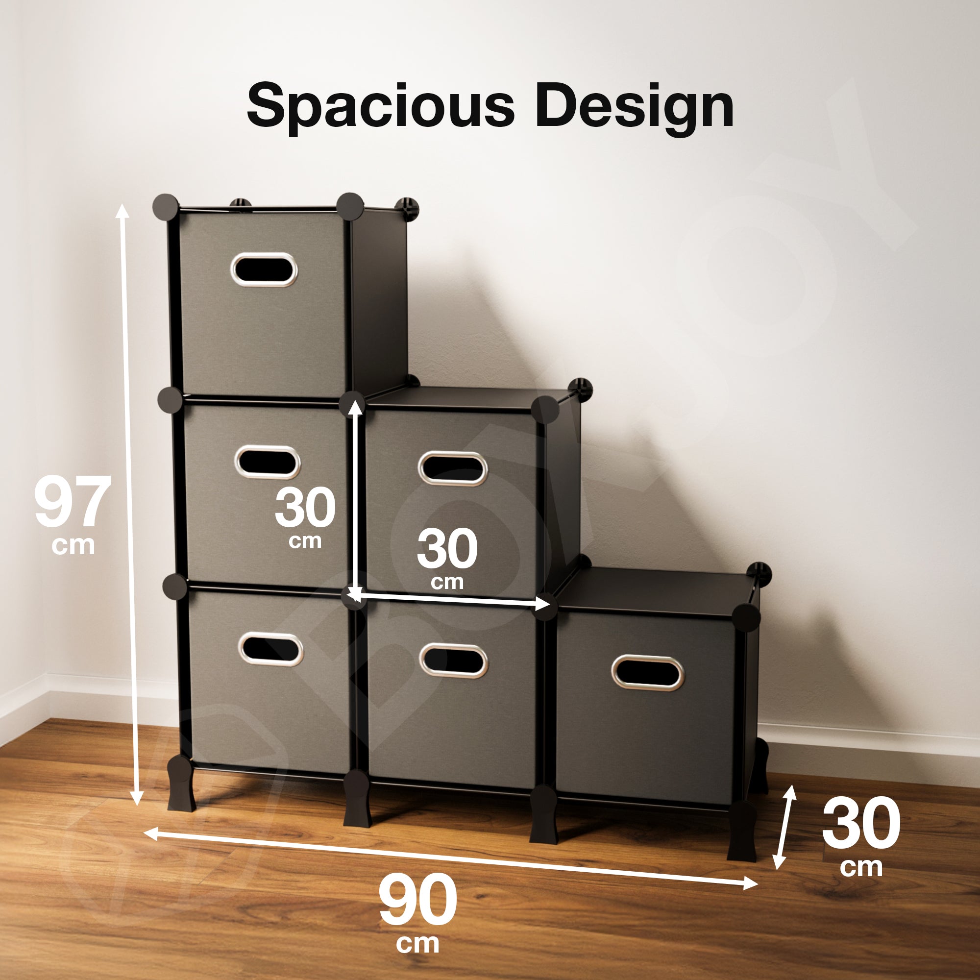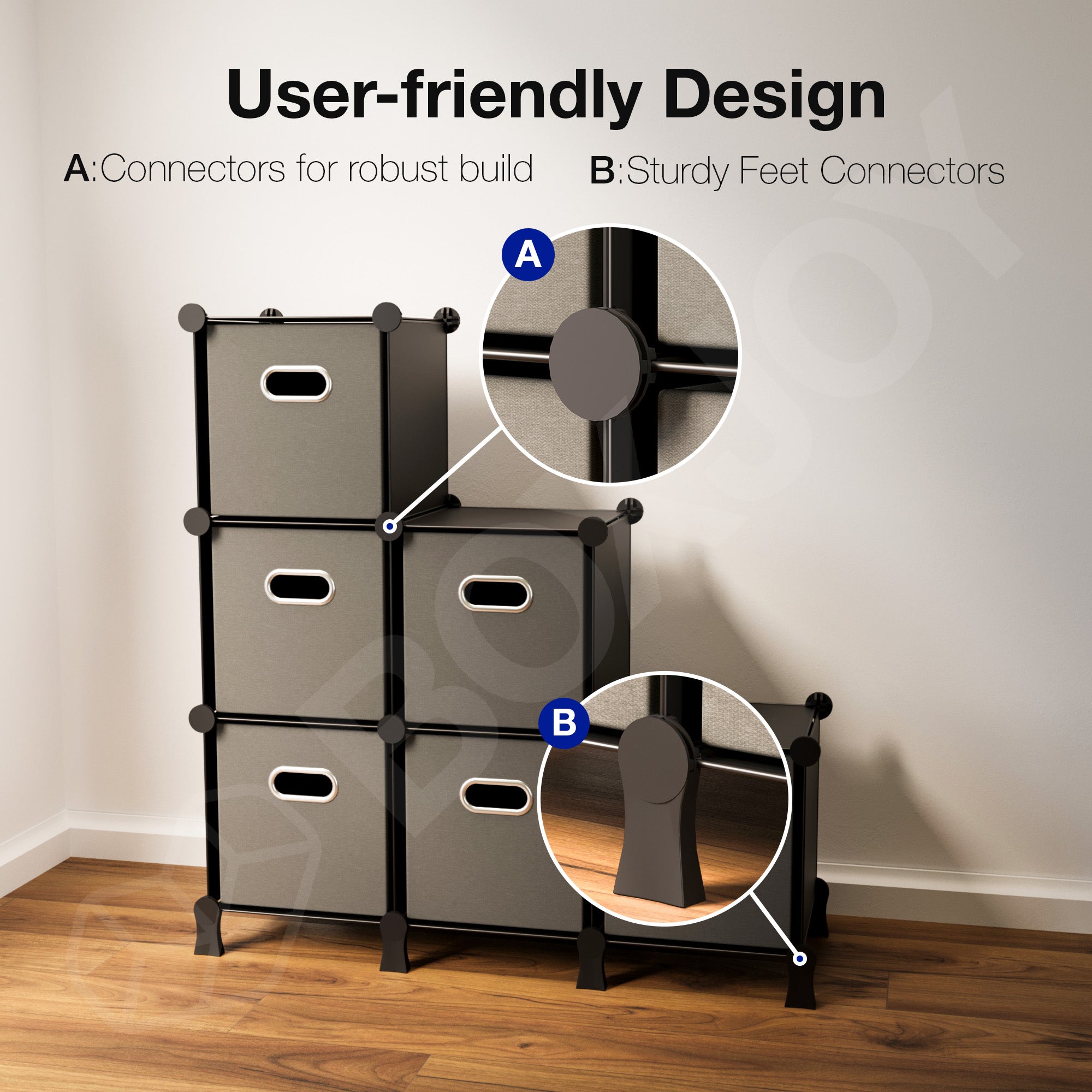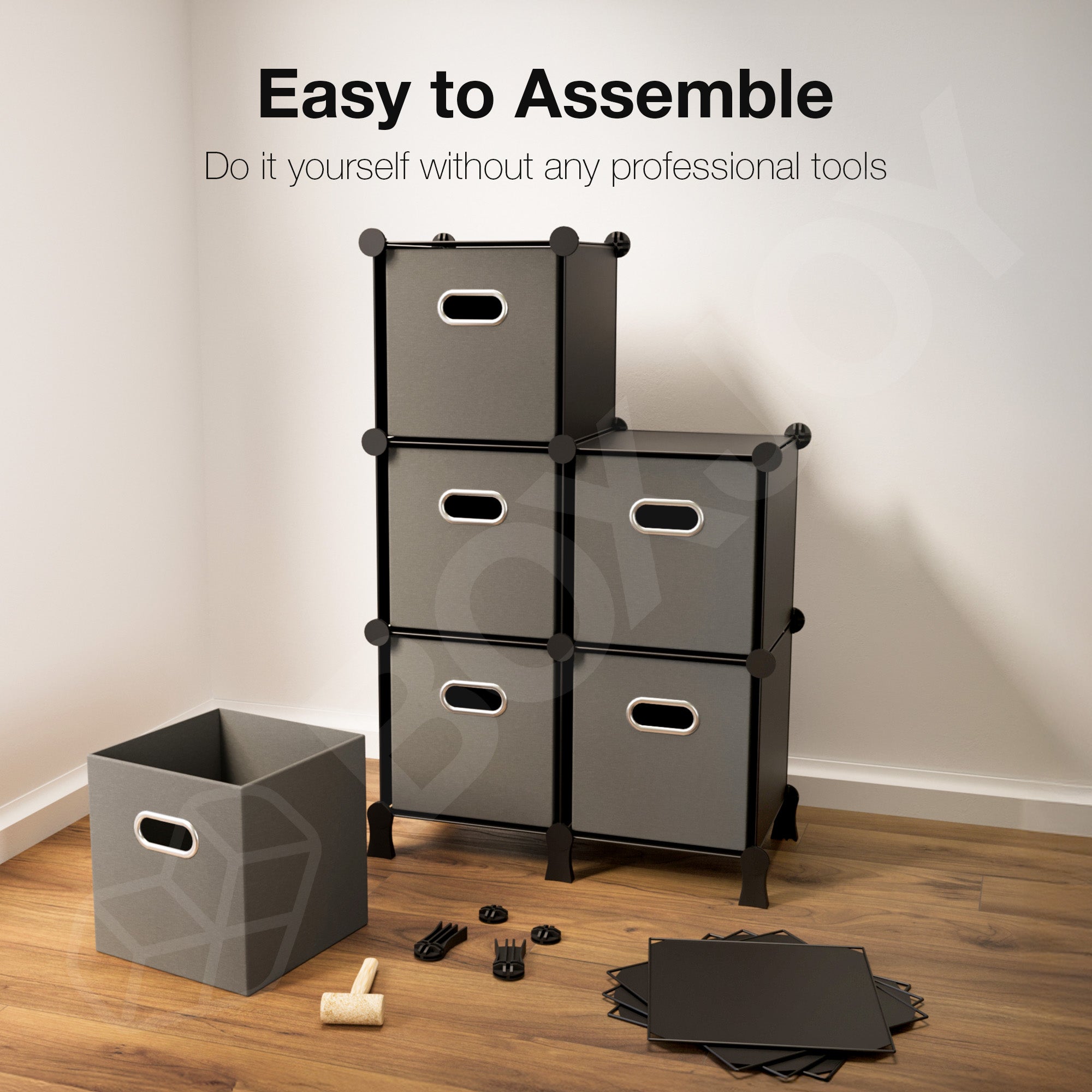 BOXJOY Plastic 6 Shelf Black Cube Storage Rack with Fabric Drawers