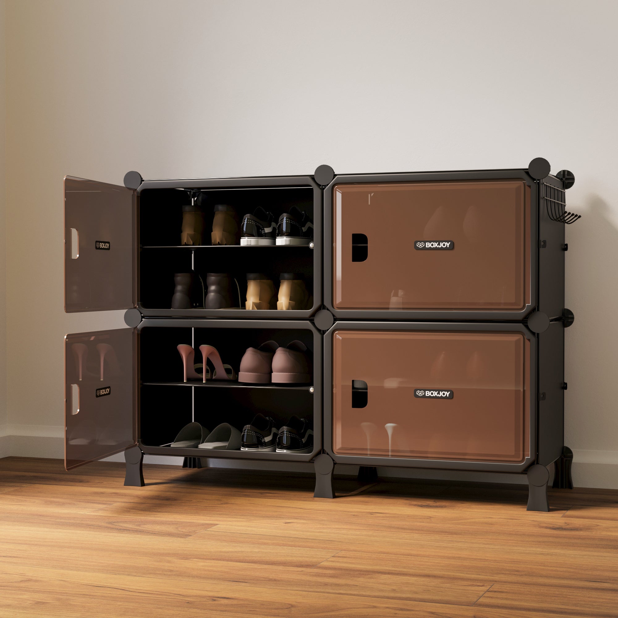 BOXJOY Hard Plastic 8 Shelf Black Shoe Rack with Brown Door