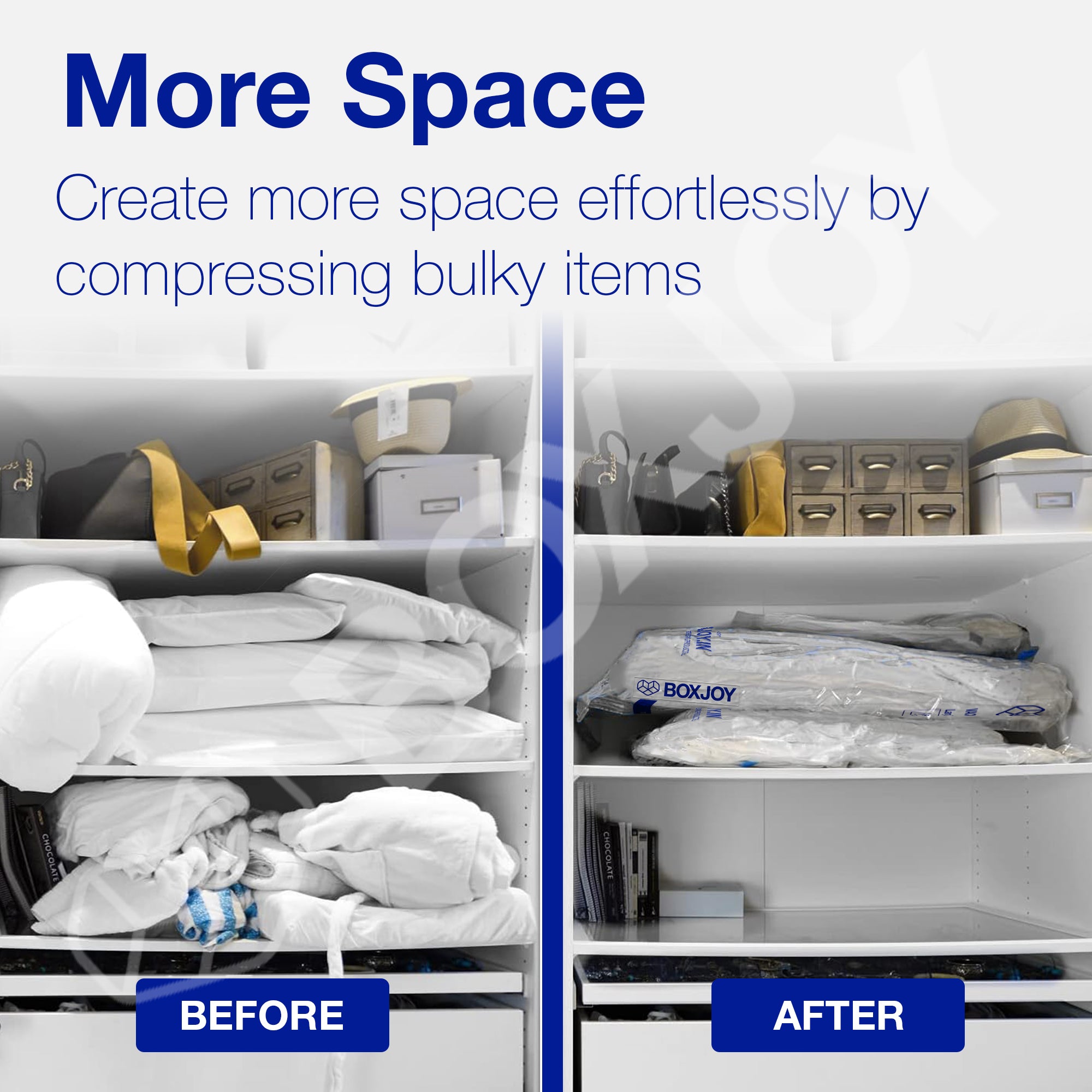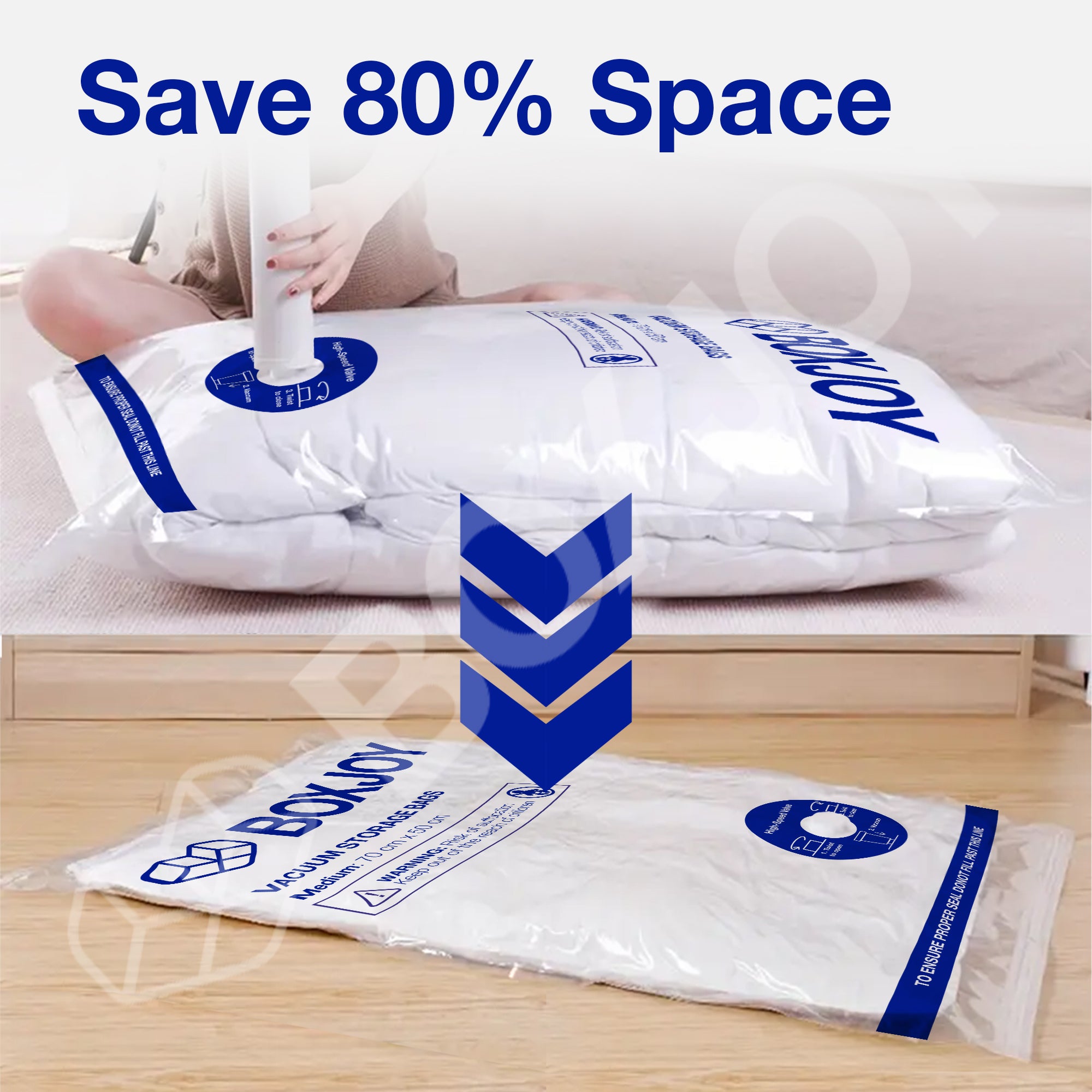 • SAVE STORAGE SPACE: Compress large items efficiently, freeing up space in your wardrobes, cupboards, or travel bags. These bags help create a clutter-free environment by reducing volume by up to 80%.